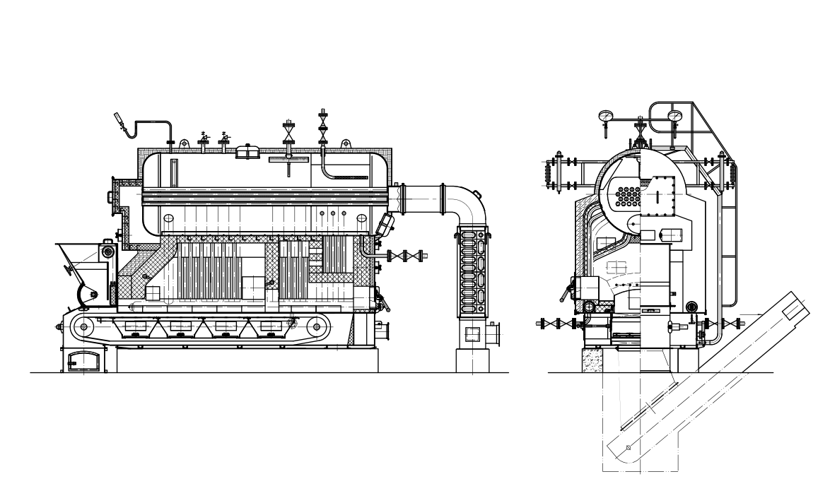產品簡介:DZL鏈條生物質臥式蒸汽鍋爐,是一種臥式三回程水火管混合式鍋爐,在鍋筒內布置一束螺紋煙管。爐膛左右二側裝有光管水冷墻。采用輕型鏈條爐排實現機械加料,配有鼓風機、引風機進行機械