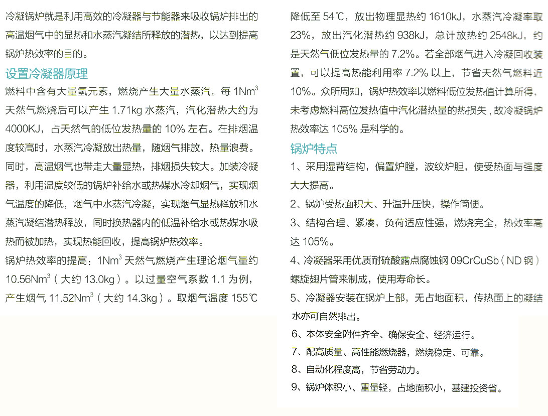 鍋爐特點 1.采用濕背結構,偏置爐膛,波紋爐膽,使受熱面與強度大大提高 2.鍋爐受熱面積大、升溫升壓快,操作簡便。 3.結構合理、緊湊,負荷適應性強,燃燒完全,熱效率高大105% 4.冷凝器采用優質耐硫酸露點腐蝕鋼09CrCuSb(ND鋼)螺旋翅片管來制成,使用壽命長。 5.冷凝器安裝在鍋爐上部,無占地面積,傳熱面上的凝結水亦可自然排出。 6.本體安全附件齊全、確保安全、經濟運行。 7.配高質量、高性能燃燒器,燃燒穩定、可靠。 8.自動化程度高,節省勞動力。 9.鍋爐體積小、重量輕,占地面積小,基建投資省。